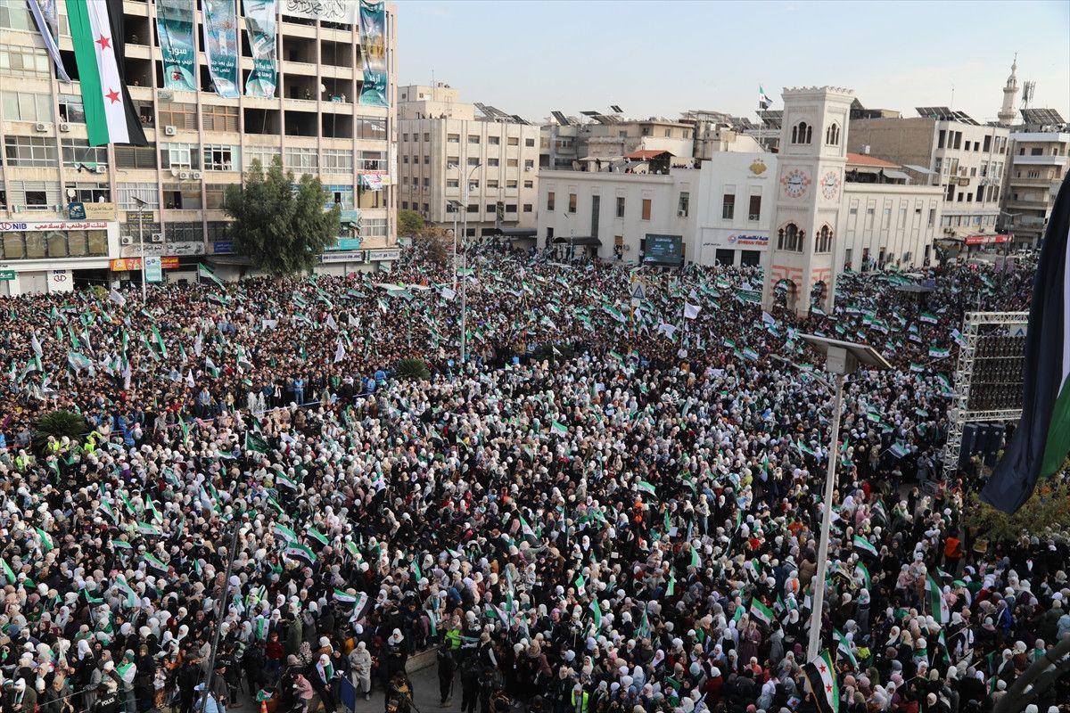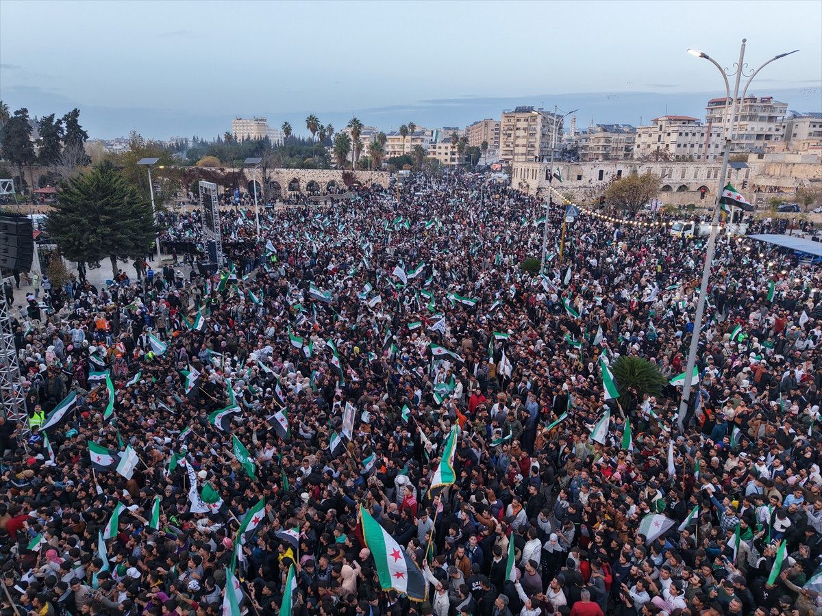 “Özgür Suriye” sloganı atan binlerce kişi, Suriye devrimi ile özdeşleşen çeşitli şarkılar söyleyerek Baas rejiminin devrilmesini kutladı.